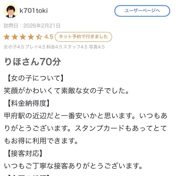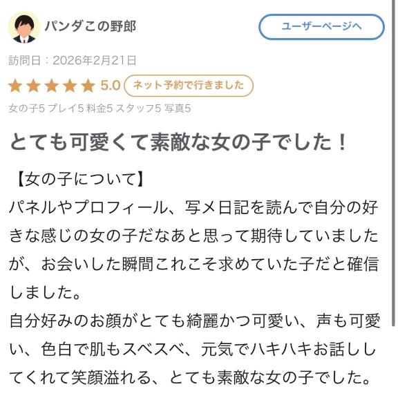 ・率直にスタイルが良く、可愛い女の子でした!会った瞬間からイチャイチャしてくれて、対応も良く、楽しい時間を過ごせました。